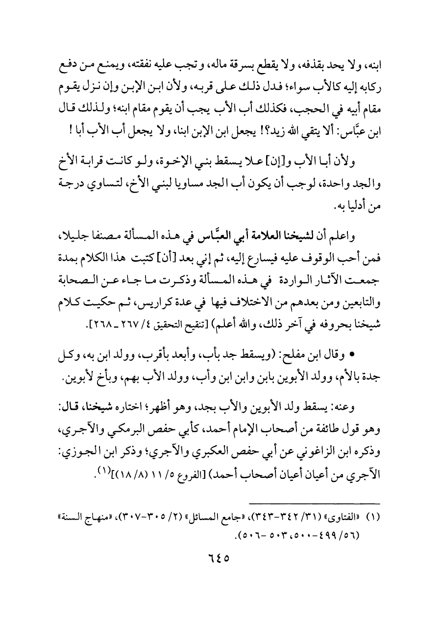 واعلم أن لشيخنا العلامة أبي العبَّاس في هذه المسألة مصنفا جليلا، فمن أحب الوقوف عليه فيسارع إليه، ثم إني بعد [أن] كتبت هذا الكلام بمدة جمعت الآثار الواردة في هذه المسألة وذكرت ما جاء عن الصحابة والتابعين ومن بعدهم من الاختلاف فيها في عدة كراريس، ثم حكيت كلام شيخنا بحروفه في آخر ذلك، والله أعلم) [تنقيح التحقيق ٤/ ٢٦٧ ــ ٢٦٨].