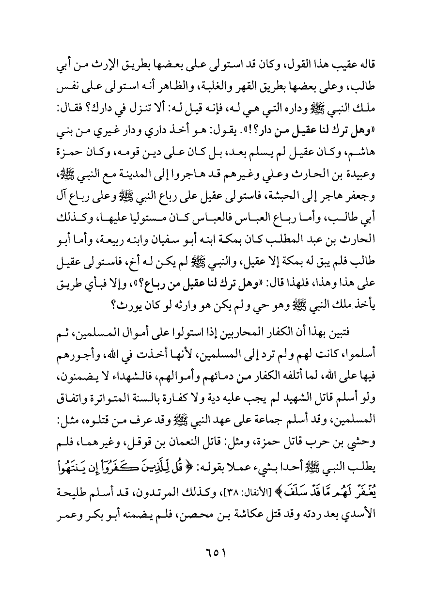 قاله عقيب هذا القول، وكان قد استولى على بعضها بطريق الإرث من أبي طالب، وعلى بعضها بطريق القهر والغلبة، والظاهر أنه استولى على نفس ملك النبي - صلى الله عليه وسلم - وداره التي هي له، فإنه قيل له: ألا تنزل في دارك؟ فقال: «وهل ترك لنا عقيل من دار؟ ! ». يقول: هو أخذ داري ودار غيري من بني هاشم، وكان عقيل لم يسلم بعد، بل كان على دين قومه، وكان حمزة وعبيدة بن الحارث وعلي وغيرهم قد هاجروا إلى المدينة مع النبي - صلى الله عليه وسلم - ، وجعفر هاجر إلى الحبشة، فاستولى عقيل على رباع النبي - صلى الله عليه وسلم - وعلى رباع آل أبي طالب، وأما رباع العباس فالعباس كان مستوليا عليها، وكذلك الحارث بن عبد المطلب كان بمكة ابنه أبو سفيان وابنه ربيعة، وأما أبو طالب فلم يبق له بمكة إلا عقيل، والنبي - صلى الله عليه وسلم - لم يكن له أخ، فاستولى عقيل على هذا وهذا، فلهذا قال: «وهل ترك لنا عقيل من رباع؟ »، وإلا فبأي طريق يأخذ ملك النبي - صلى الله عليه وسلم - وهو حي ولم يكن هو وارثه لو كان يورث؟