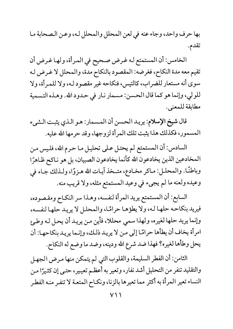 السابع: أن المستمتع يريد المرأة لنفسه، وهذا سر النكاح ومقصوده، فيريد بنكاحه حلها له، ولا يطؤها حرامًا، والمحلل لا يريد حلها لنفسه، وإنما يريد حلها لغيره، ولهذا سمي محللا، فأين من يريد أن يحل له وطئ امرأة يخاف أن يطأها حرامًا إلى من لا يريد ذلك، وإنما يريد بنكاحها: أن يحل وطأها لغيره؟ فهذا ضد شرع الله ودينه، وضد ما وضع له النكاح.