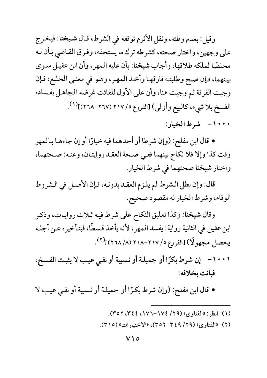 - قال ابن مفلح: (وإن شرطا أو أحدهما فيه خيارًا أو إن جاءها بالمهر وقت كذا وإلا فلا نكاح بينهما ففي صحة العقد روايتان، وعنه: صحتهما، واختار شيخنا صحتهما في شرط الخيار.