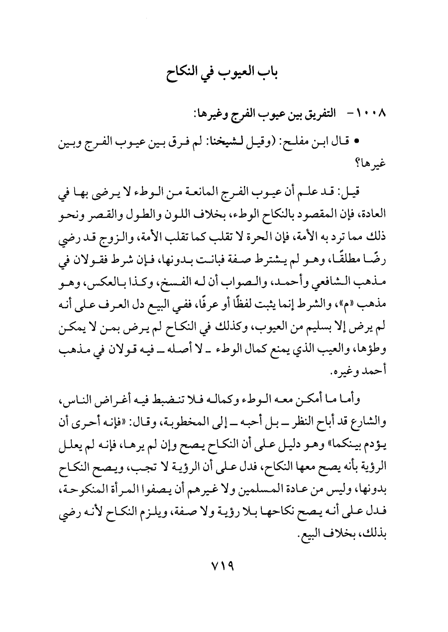 - قال ابن مفلح: (وقيل لشيخنا: لم فرق بين عيوب الفرج وبين غيرها؟