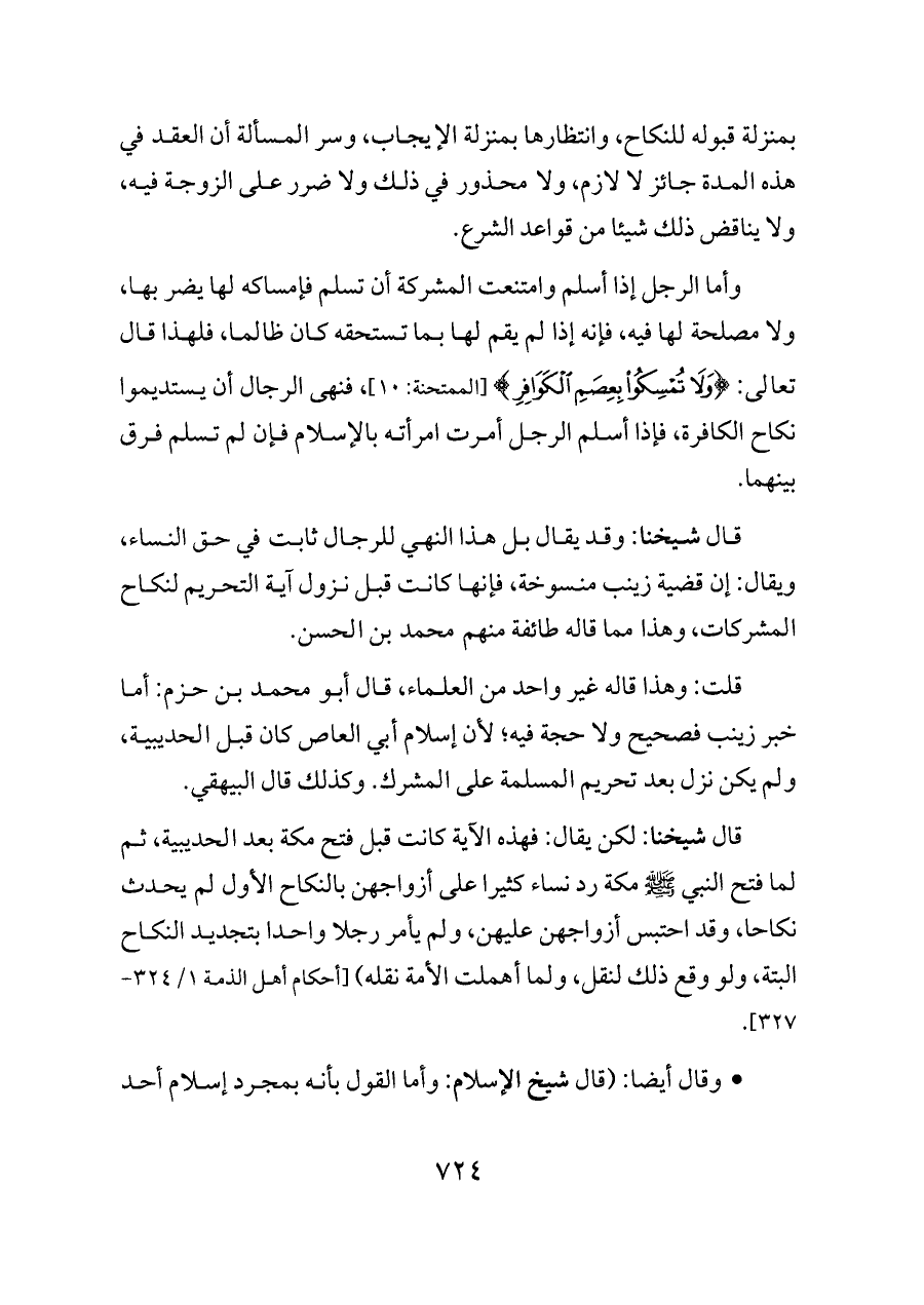 قال شيخنا: لكن يقال: فهذه الآية كانت قبل فتح مكة بعد الحديبية، ثم لما فتح النبي - صلى الله عليه وسلم - مكة رد نساء كثيرا على أزواجهن بالنكاح الأول لم يحدث نكاحا، وقد احتبس أزواجهن عليهن، ولم يأمر رجلا واحدا بتجديد النكاح البتة، ولو وقع ذلك لنقل، ولما أهملت الأمة نقله) [أحكام أهل الذمة ١/ ٣٢٤ - ٣٢٧].