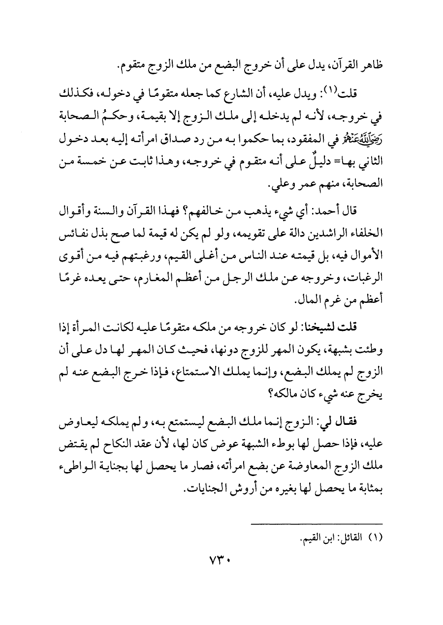 قلت (¬١): ويدل عليه، أن الشارع كما جعله متقومًا في دخوله، فكذلك في خروجه، لأنه لم يدخله إلى ملك الزوج إلا بقيمة، وحكمُ الصحابة - رضي الله عنهم - في المفقود، بما حكموا به من رد صداق امرأته إليه بعد دخول الثاني بها= دليلٌ على أنه متقوم في خروجه، وهذا ثابت عن خمسة من الصحابة، منهم عمر وعلي.