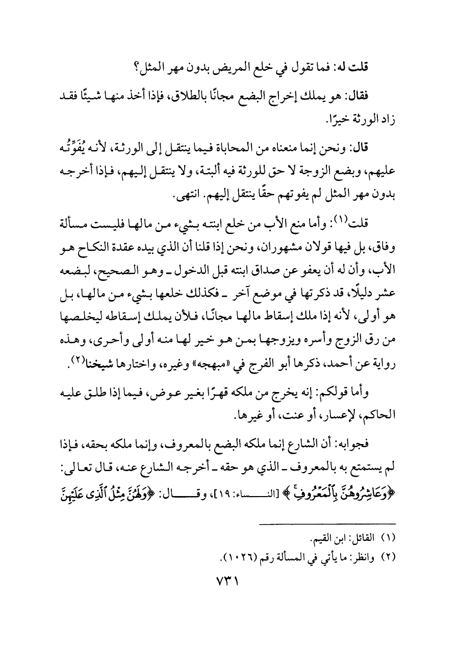 فقال: هو يملك إخراج البضع مجانًا بالطلاق، فإذا أخذ منها شيئًا فقد زاد الورثة خيرًا.