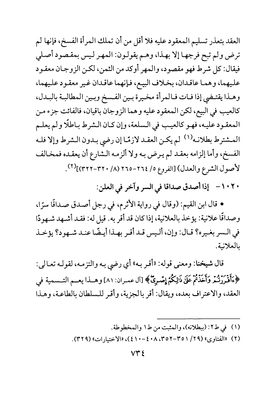 العقد بتعذر تسليم المعقود عليه فلا أقل من أن تملك المرأة الفسخ، فإنها لم ترض ولم تبح فرجها إلا بهذا، وهم يقولون: المهر ليس بمقصود أصلي فيقال: كل شرط فهو مقصود، والمهر أوكد من الثمن، لكن الزوجان معقود عليهما، وهما عاقدان، بخلاف البيع، فإنهما عاقدان غير معقود عليهما، وهذا يقتضي إذا فات فالمرأة مخيرة بين الفسخ وبين المطالبة بالبدل، كالعيب في البيع، لكن المعقود عليه وهما الزوجان باقيان، فالفائت جزء من المعقود عليه، فهو كالعيب في السلعة، وإن كان الشرط باطلًا ولم يعلم المشترط بطلانه (¬١) لم يكن العقد لازمًا إن رضي بدون الشرط وإلا فله الفسخ، وأما إلزامه بعقد لم يرض به ولا ألزمه الشارع أن يعقده فمخالف لأصول الشرع والعدل) [الفروع ٥/ ٢٦٤ - ٢٦٥ (٨/ ٣٢٠ - ٣٢٢)] (¬٢).
