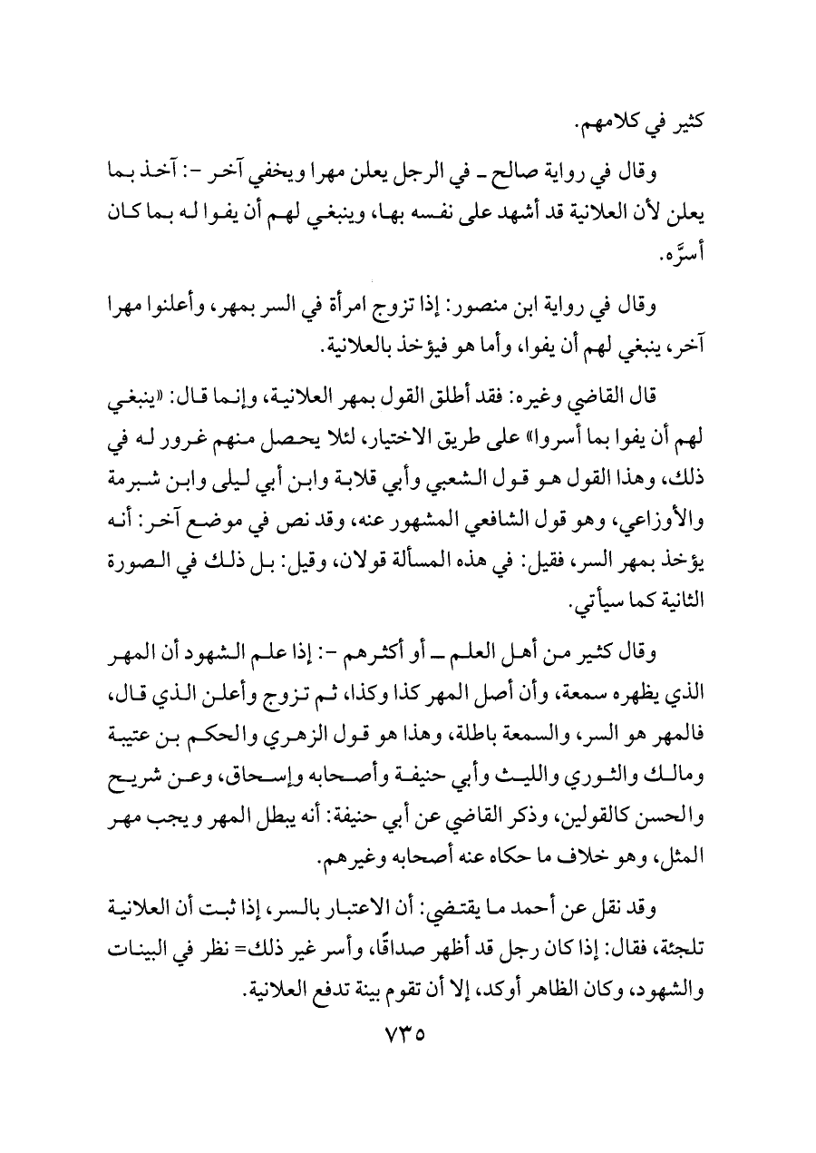 وقال في رواية صالح ــ في الرجل يعلن مهرا ويخفي آخر -: آخذ بما يعلن لأن العلانية قد أشهد على نفسه بها، وينبغي لهم أن يفوا له بما كان أسرَّه.