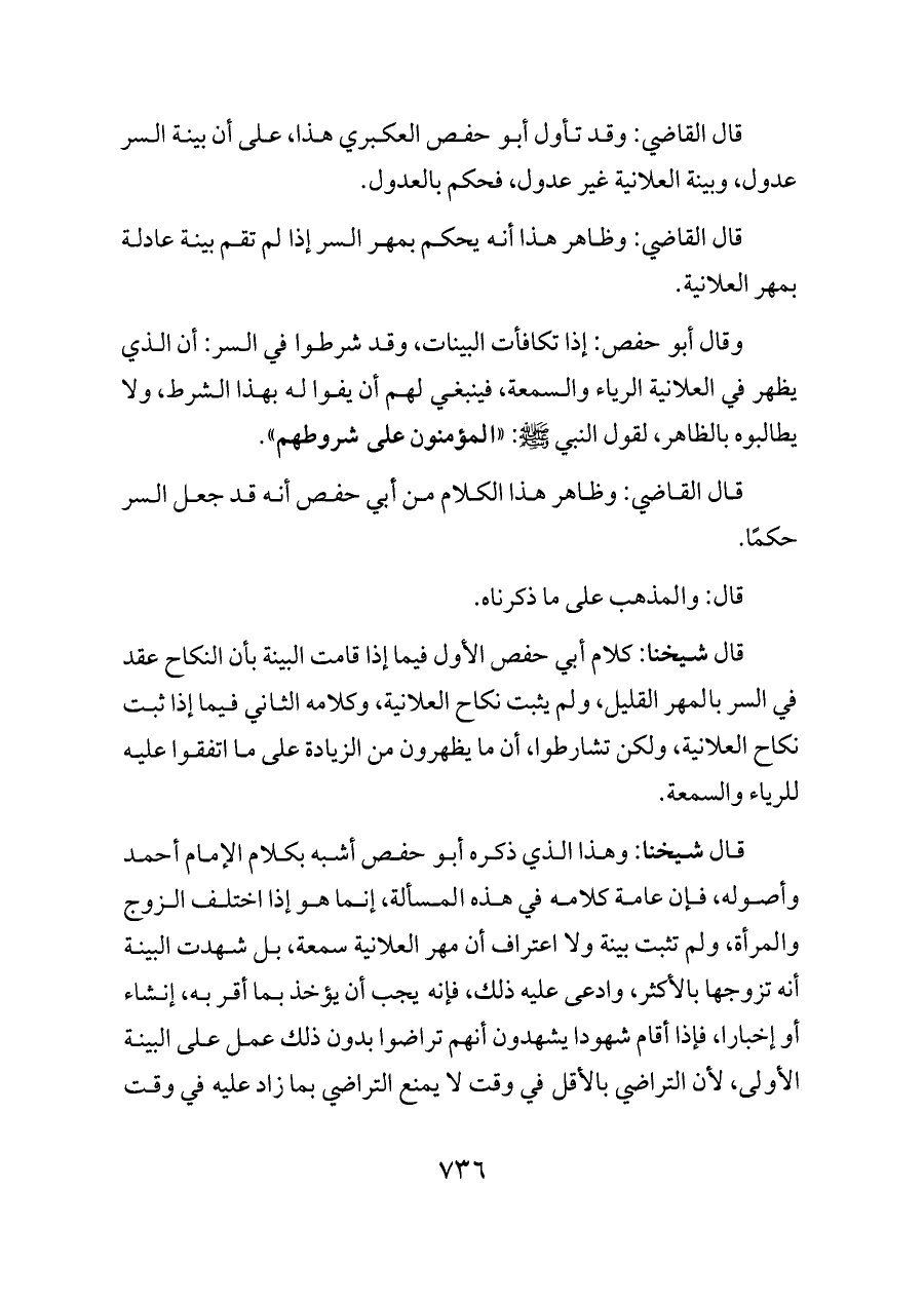 قال شيخنا: كلام أبي حفص الأول فيما إذا قامت البينة بأن النكاح عقد في السر بالمهر القليل، ولم يثبت نكاح العلانية، وكلامه الثاني فيما إذا ثبت نكاح العلانية، ولكن تشارطوا، أن ما يظهرون من الزيادة على ما اتفقوا عليه للرياء والسمعة.