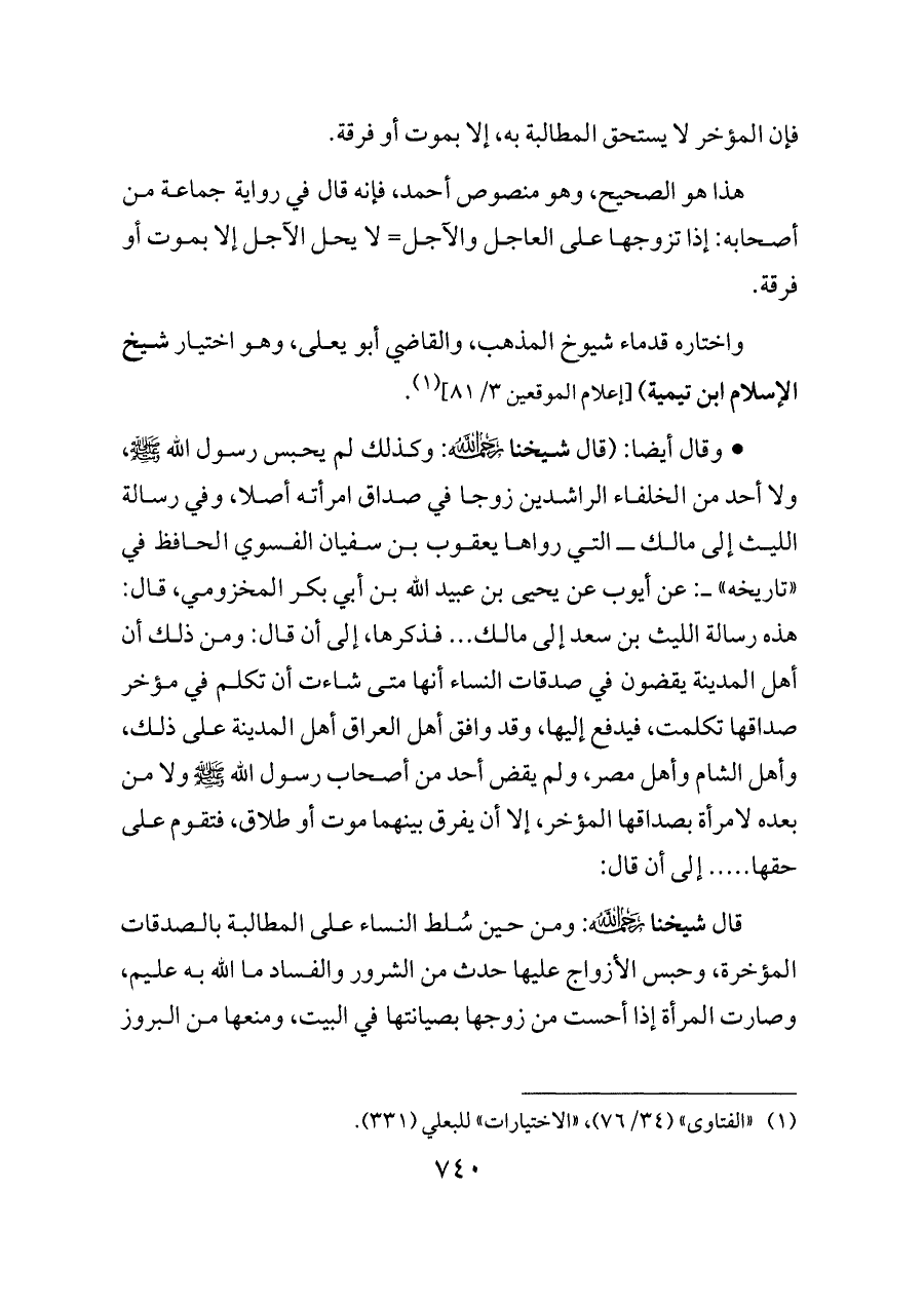 - وقال أيضا: (قال شيخنا - رحمه الله -: وكذلك لم يحبس رسول الله - صلى الله عليه وسلم - ، ولا أحد من الخلفاء الراشدين زوجا في صداق امرأته أصلا، وفي رسالة الليث إلى مالك ــ التي رواها يعقوب بن سفيان الفسوي الحافظ في «تاريخه» ــ: عن أيوب عن يحيى بن عبيد الله بن أبي بكر المخزومي، قال: هذه رسالة الليث بن سعد إلى مالك ... فذكرها، إلى أن قال: ومن ذلك أن أهل المدينة يقضون في صدقات النساء أنها متى شاءت أن تكلم في مؤخر صداقها تكلمت، فيدفع إليها، وقد وافق أهل العراق أهل المدينة على ذلك، وأهل الشام وأهل مصر، ولم يقض أحد من أصحاب رسول الله - صلى الله عليه وسلم - ولا من بعده لامرأة بصداقها المؤخر، إلا أن يفرق بينهما موت أو طلاق، فتقوم على حقها ..... إلى أن قال: