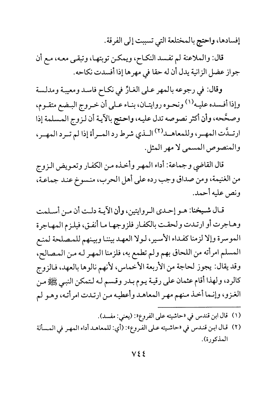 (¬٢) قال ابن قندس في «حاشيته على الفروع»: (أي: للمعاهد أداء المهر في المسألة المذكورة).