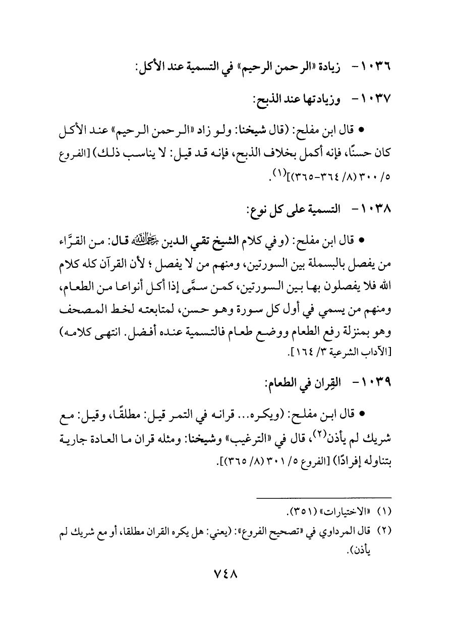 - قال ابن مفلح: (قال شيخنا: ولو زاد «الرحمن الرحيم» عند الأكل كان حسنًا، فإنه أكمل بخلاف الذبح، فإنه قد قيل: لا يناسب ذلك) [الفروع ٥/ ٣٠٠ (٨/ ٣٦٤ - ٣٦٥)] (¬١).