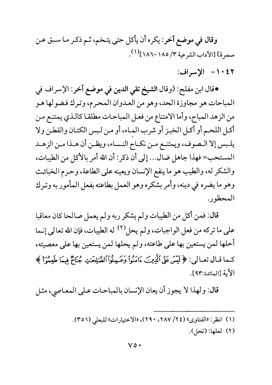 - قال ابن مفلح: (وقال الشيخ تقي الدين في موضع آخر: الإسراف في المباحات هو مجاوزة الحد، وهو من العدوان المحرم، وترك فضولها هو من الزهد المباح، وأما الامتناع من فعل المباحات مطلقا كالذي يمتنع من أكل اللحم أو أكل الخبز أو شرب الماء، أو من لبس الكتان والقطن ولا يلبس إلا الصوف، ويمتنع من نكاح النساء، ويظن أن هذا من الزهد المستحب= فهذا جاهل ضال ... إلى أن ذكر: أن الله أمر بالأكل من الطيبات، والشكر له، والطيب هو ما ينفع الإنسان ويعينه على الطاعة، وحرم الخبائث وهو ما يضره في دينه، وأمر بشكره وهو العمل بطاعته بفعل المأمور به وترك المحظور.
