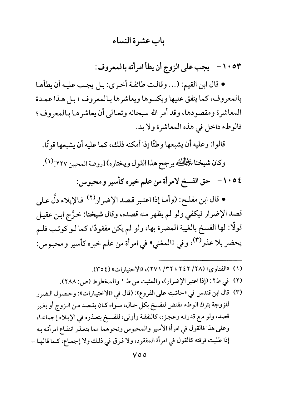 (¬٣) قال ابن قندس في «حاشيته على الفروع»: (قال في «الاختيارات»: وحصول الضرر للزوجة بترك الوطء مقتض للفسخ بكل حال، سواء كان بقصد من الزوج أو بغير قصد، ولو مع قدرته وعجزه، كالنفقة وأولى، للفسخ بتعذره في الإيلاء إجماعا، وعلى هذا فالقول في امرأة الأسير والمحبوس ونحوهما مما يتعذر انتفاع امرأته به إذا طلبت فرقته كالقول في امرأة المفقود، ولا فرق في ذلك ولا إجماع، كما قالها أبو محمد المقدسي. انتهى.