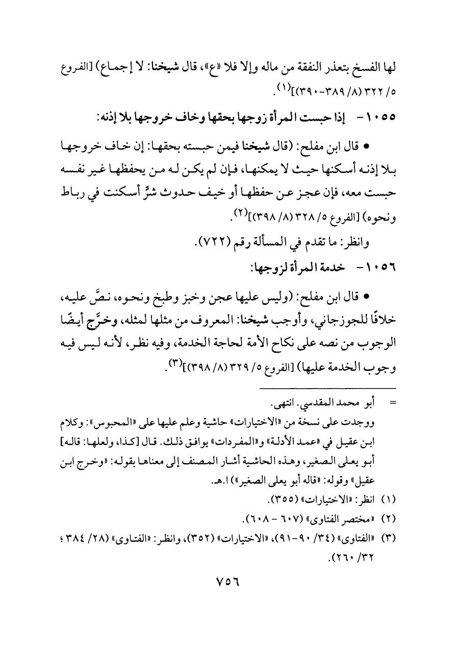 - قال ابن مفلح: (وليس عليها عجن وخبز وطبخ ونحوه، نصَّ عليه، خلافًا للجوزجاني، وأوجب شيخنا: المعروف من مثلها لمثله، وخرَّج أيضًا الوجوب من نصه على نكاح الأمة لحاجة الخدمة، وفيه نظر، لأنه ليس فيه وجوب الخدمة عليها) [الفروع ٥/ ٣٢٩ (٨/ ٣٩٨)] (¬٣).