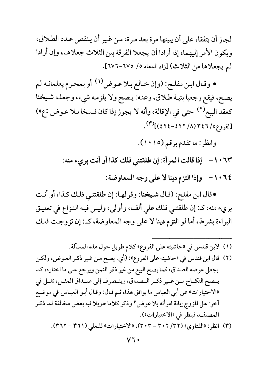 - قال ابن مفلح: (قال شيخنا: وقولها: إن طلقتني فلك كذا، أو أنت بريء منه، كـ: إن طلقتني فلك علي ألف، وأولى، وليس فيه النزاع في تعليق البراءة بشرط، أما لو التزم دينا لا على وجه المعاوضة، كـ: إن تزوجت فلك