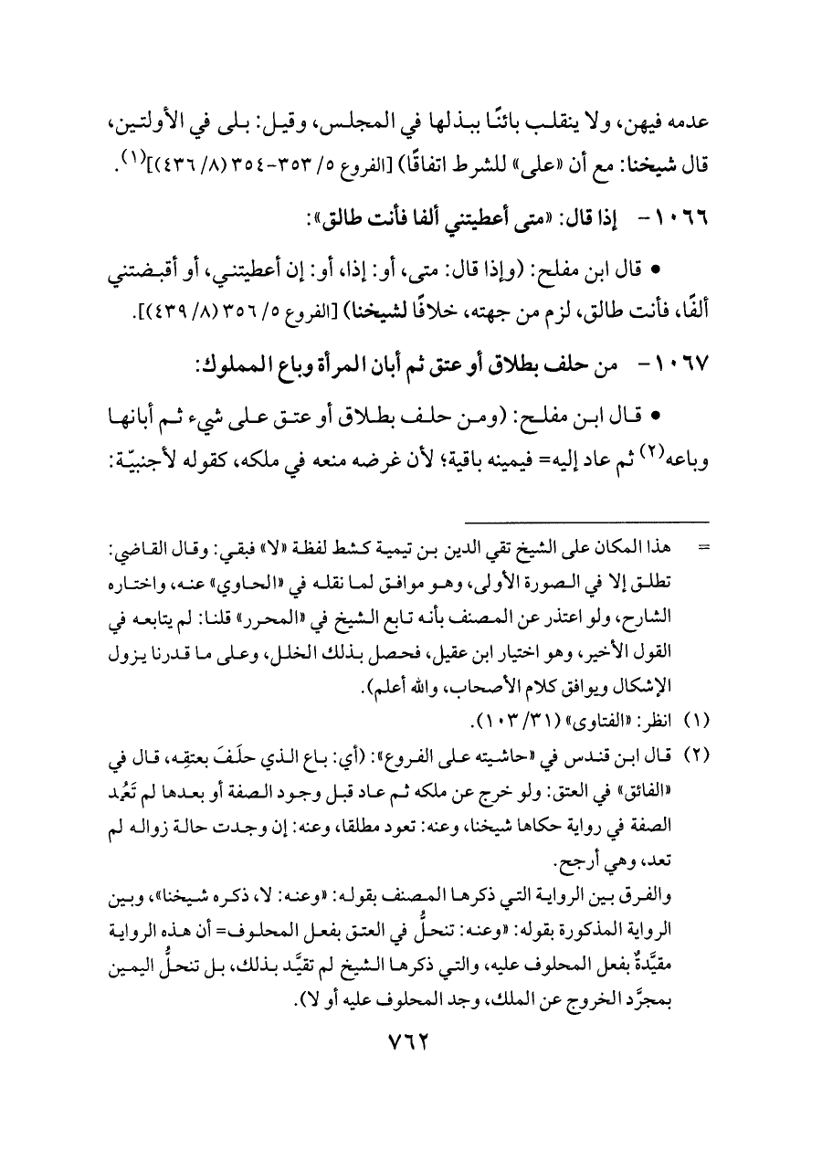 (¬٢) قال ابن قندس في «حاشيته على الفروع»: (أي: باع الذي حلَفَ بعتقِه، قال في «الفائق» في العتق: ولو خرج عن ملكه ثم عاد قبل وجود الصفة أو بعدها لم تَعُد الصفة في رواية حكاها شيخنا، وعنه: تعود مطلقا، وعنه: إن وجدت حالة زواله لم تعد، وهي أرجح.