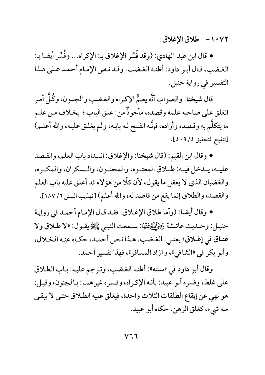 - وقال أيضا: (وأما طلاق الإغلاق: فقد قال الإمام أحمد في رواية حنبل: وحديث عائشة - رضي الله عنها -: سمعت النبي - صلى الله عليه وسلم - يقول: «لا طلاق ولا عتاق في إغلاق» يعني: الغضب. هذا نص أحمد، حكاه عنه الخلال، وأبو بكر في «الشافي»، و «زاد المسافر»، فهذا تفسير أحمد.