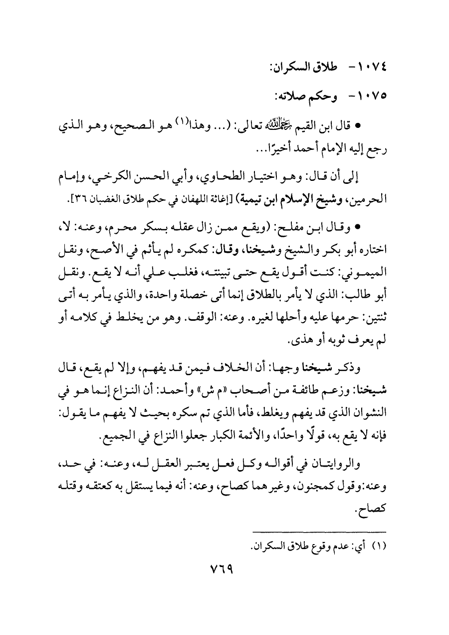 - وقال ابن مفلح: (ويقع ممن زال عقله بسكر محرم، وعنه: لا، اختاره أبو بكر والشيخ وشيخنا، وقال: كمكره لم يأثم في الأصح، ونقل الميموني: كنت أقول يقع حتى تبينته، فغلب علي أنه لا يقع. ونقل أبو طالب: الذي لا يأمر بالطلاق إنما أتى خصلة واحدة، والذي يأمر به أتى ثنتين: حرمها عليه وأحلها لغيره. وعنه: الوقف. وهو من يخلط في كلامه أو لم يعرف ثوبه أو هذى.