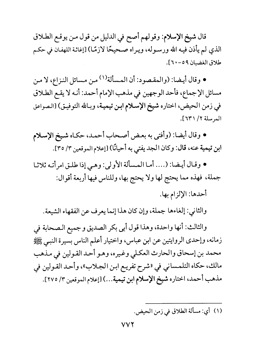 - وقال أيضا: (والمقصود: أن المسألة (¬١) من مسائل النزاع، لا من مسائل الإجماع، فأحد الوجهين في مذهب الإمام أحمد: أنه لا يقع الطلاق في زمن الحيض، اختاره شيخ الإسلام ابن تيمية، وبالله التوفيق) [الصواعق المرسلة ٢/ ٦٣١].