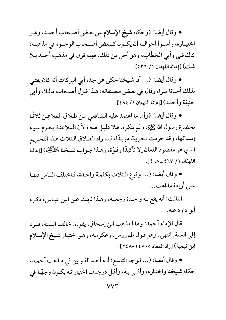 - وقال أيضا: ( ... أن شيخنا حكى عن جده أبي البركات أنه كان يفتي بذلك أحيانا سرا، وقال في بعض مصنفاته: هذا قول أصحاب مالك وأبي حنيفة وأحمد) [إغاثة اللهفان ١/ ٤٨٤].