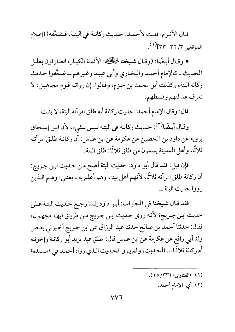 - وقال أيضًا: (وقال شيخنا - رحمه الله -: الأئمة الكبار، العارفون بعلل الحديث ــ كالإمام أحمد والبخاري وأبي عبيد وغيرهم ــ ضعَّفوا حديث ركانه البتة، وكذلك أبو محمد بن حزم، وقالوا: إن رواته قوم مجاهيل، لا تعرف عدالتهم وضبطهم.