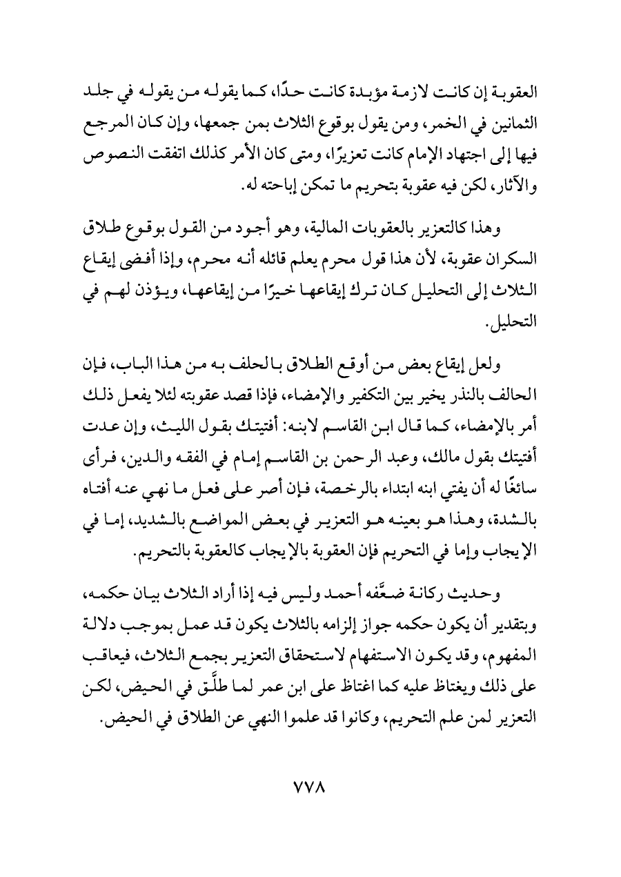ولعل إيقاع بعض من أوقع الطلاق بالحلف به من هذا الباب، فإن الحالف بالنذر يخير بين التكفير والإمضاء، فإذا قصد عقوبته لئلا يفعل ذلك أمر بالإمضاء، كما قال ابن القاسم لابنه: أفتيتك بقول الليث، وإن عدت أفتيتك بقول مالك، وعبد الرحمن بن القاسم إمام في الفقه والدين، فرأى سائغًا له أن يفتي ابنه ابتداء بالرخصة، فإن أصر على فعل ما نهي عنه أفتاه بالشدة، وهذا هو بعينه هو التعزير في بعض المواضع بالشديد، إما في الإيجاب وإما في التحريم فإن العقوبة بالإيجاب كالعقوبة بالتحريم.
