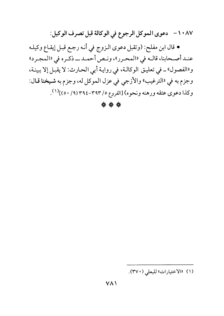 - قال ابن مفلح: (وتقبل دعوى الزوج في أنه رجع قبل إيقاع وكيله عند أصحابنا، قاله في «المحرر»، ونص أحمد ــ ذكره في «المجرد» و «الفصول» ــ في تعليق الوكالة، في رواية أبي الحارث: لا يقبل إلا ببينة، وجزم به في «الترغيب» والأزجي في عزل الموكل له، وجزم به شيخنا قال: وكذا دعوى عتقه ورهنه ونحوه) [الفروع ٥/ ٣٩٣ - ٣٩٤ (٩/ ٥٠)] (¬١).