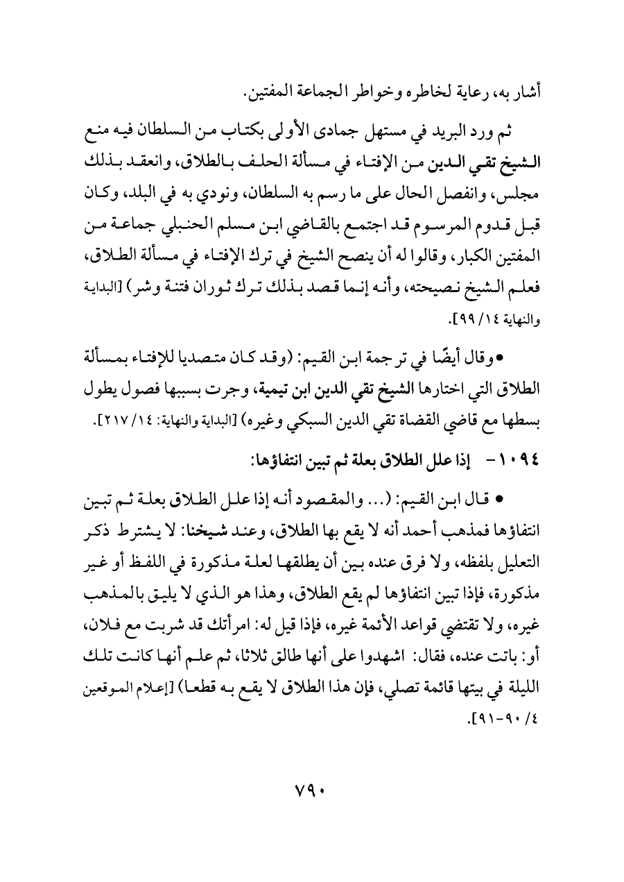 ثم ورد البريد في مستهل جمادى الأولى بكتاب من السلطان فيه منع الشيخ تقي الدين من الإفتاء في مسألة الحلف بالطلاق، وانعقد بذلك مجلس، وانفصل الحال على ما رسم به السلطان، ونودي به في البلد، وكان قبل قدوم المرسوم قد اجتمع بالقاضي ابن مسلم الحنبلي جماعة من المفتين الكبار، وقالوا له أن ينصح الشيخ في ترك الإفتاء في مسألة الطلاق، فعلم الشيخ نصيحته، وأنه إنما قصد بذلك ترك ثوران فتنة وشر) [البداية والنهاية ١٤/ ٩٩].