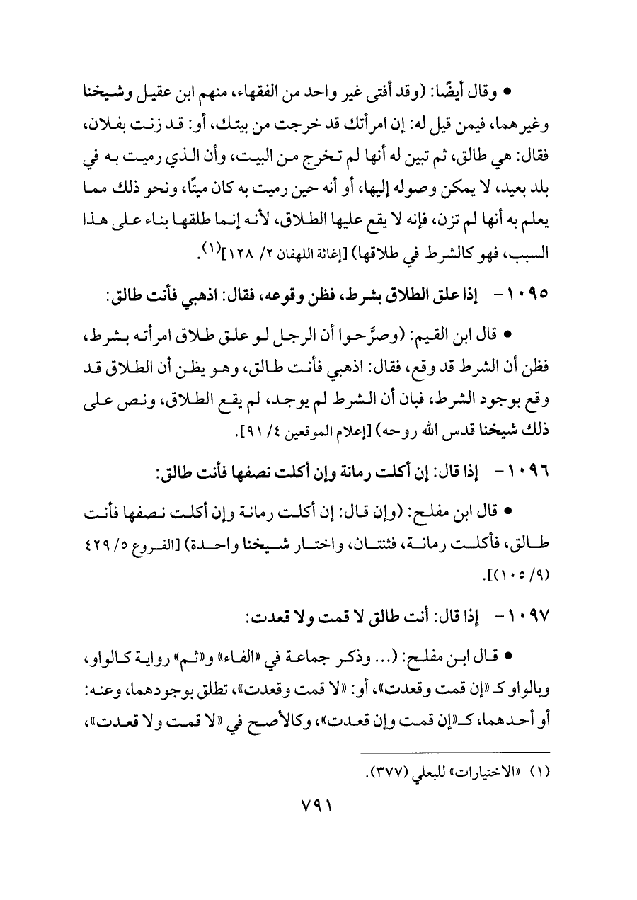 - وقال أيضًا: (وقد أفتى غير واحد من الفقهاء، منهم ابن عقيل وشيخنا وغيرهما، فيمن قيل له: إن امرأتك قد خرجت من بيتك، أو: قد زنت بفلان، فقال: هي طالق، ثم تبين له أنها لم تخرج من البيت، وأن الذي رميت به في بلد بعيد، لا يمكن وصوله إليها، أو أنه حين رميت به كان ميتًا، ونحو ذلك مما يعلم به أنها لم تزن، فإنه لا يقع عليها الطلاق، لأنه إنما طلقها بناء على هذا السبب، فهو كالشرط في طلاقها) [إغاثة اللهفان ٢/ ١٢٨] (¬١).