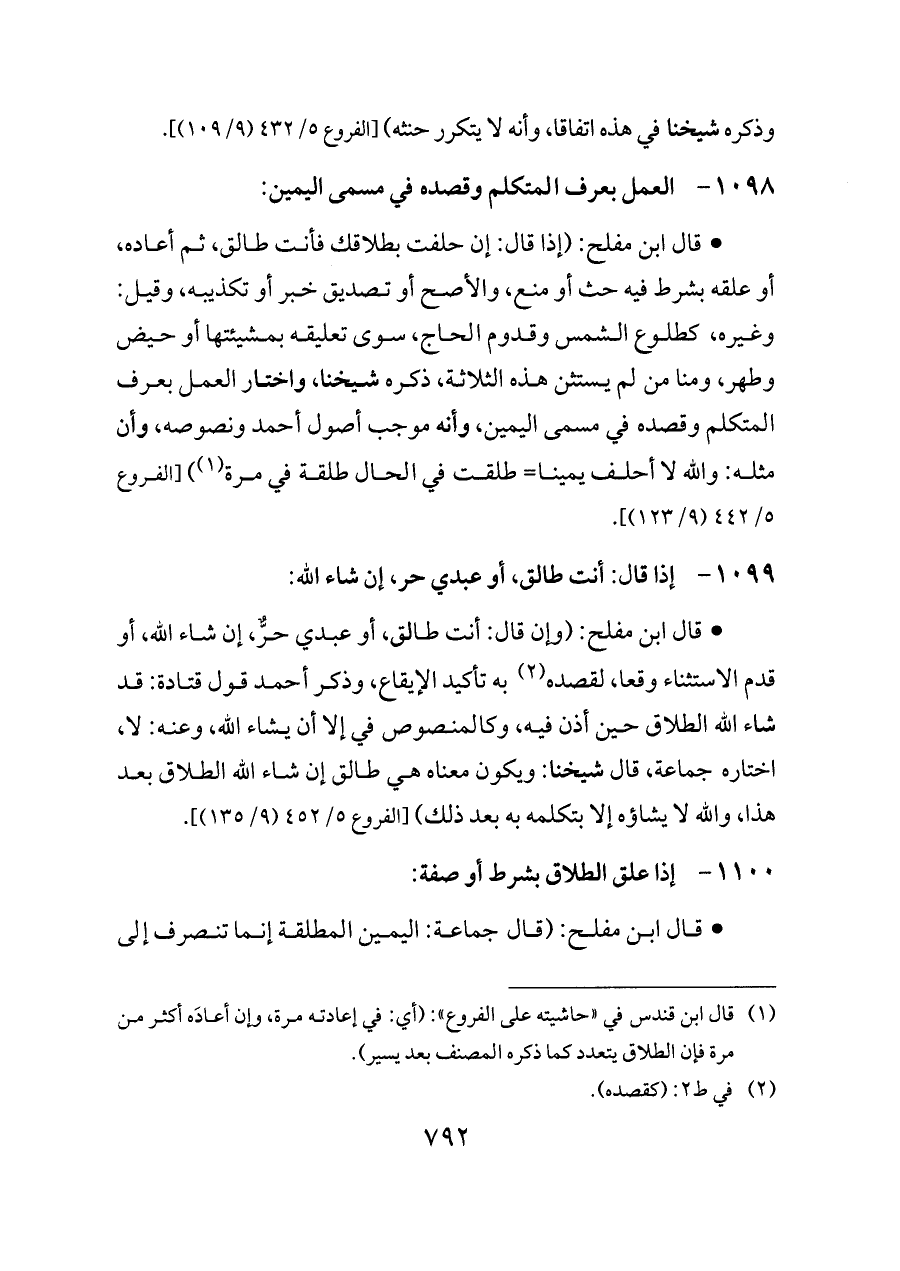 - قال ابن مفلح: (إذا قال: إن حلفت بطلاقك فأنت طالق، ثم أعاده، أو علقه بشرط فيه حث أو منع، والأصح أو تصديق خبر أو تكذيبه، وقيل: وغيره، كطلوع الشمس وقدوم الحاج، سوى تعليقه بمشيئتها أو حيض وطهر، ومنا من لم يستثن هذه الثلاثة، ذكره شيخنا, واختار العمل بعرف المتكلم وقصده في مسمى اليمين, وأنه موجب أصول أحمد ونصوصه، وأن مثله: والله لا أحلف يمينا= طلقت في الحال طلقة في مرة (¬١)) [الفروع ٥/ ٤٤٢ (٩/ ١٢٣)].