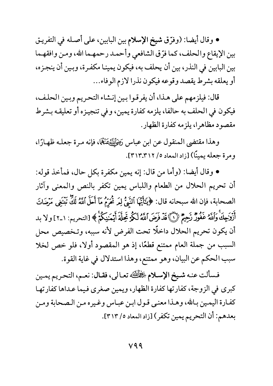 - وقال أيضا: (وأما من قال: إنه يمين مكفرة بكل حال، فمأخذ قوله: أن تحريم الحلال من الطعام واللباس يمين تكفر بالنص والمعنى وآثار الصحابة، فإن الله سبحانه قال: {يَاأَيُّهَا النَّبِيُّ لِمَ تُحَرِّمُ مَا أَحَلَّ اللَّهُ لَكَ تَبْتَغِي مَرْضَاتَ أَزْوَاجِكَ وَاللَّهُ غَفُورٌ رَحِيمٌ (١) قَدْ فَرَضَ اللَّهُ لَكُمْ تَحِلَّةَ أَيْمَانِكُمْ} [التحريم: ١ ــ ٢] ولا بد أن يكون تحريم الحلال داخلًا تحت الفرض لأنه سببه، وتخصيص محل السبب من جملة العام ممتنع قطعًا، إذ هو المقصود أولا، فلو خص لخلا سبب الحكم عن البيان، وهو ممتنع، وهذا استدلال في غاية القوة.