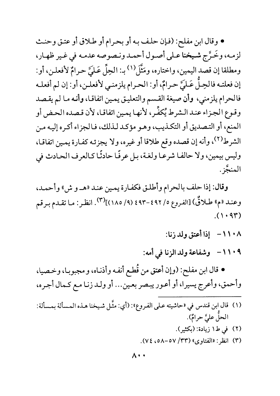 (¬١) قال ابن قندس في «حاشيته على الفروع»: (أي: مثَّل شيخنا هذه المسألة بمسألة: الحلُّ عليَّ حرامٌ).