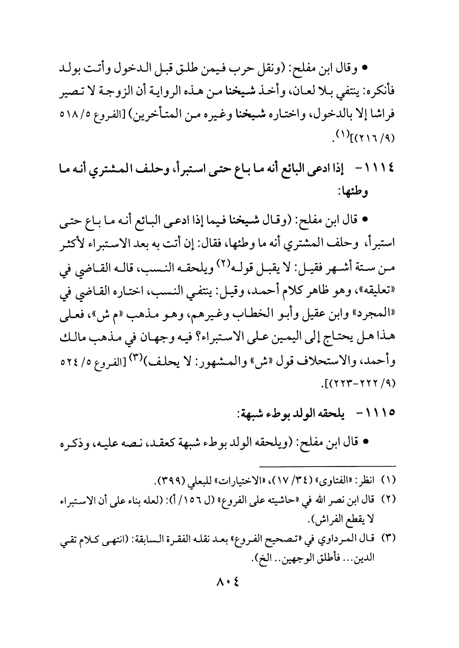 - قال ابن مفلح: (وقال شيخنا فيما إذا ادعى البائع أنه ما باع حتى استبرأ، وحلف المشتري أنه ما وطئها، فقال: إن أتت به بعد الاستبراء لأكثر من ستة أشهر فقيل: لا يقبل قوله (¬٢) ويلحقه النسب، قاله القاضي في «تعليقه»، وهو ظاهر كلام أحمد، وقيل: ينتفي النسب، اختاره القاضي في «المجرد» وابن عقيل وأبو الخطاب وغيرهم، وهو مذهب «م ش»، فعلى هذا هل يحتاج إلى اليمين على الاستبراء؟ فيه وجهان في مذهب مالك وأحمد، والاستحلاف قول «ش» والمشهور: لا يحلف) (¬٣) [الفروع ٥/ ٥٢٤ (٩/ ٢٢٢ - ٢٢٣)].