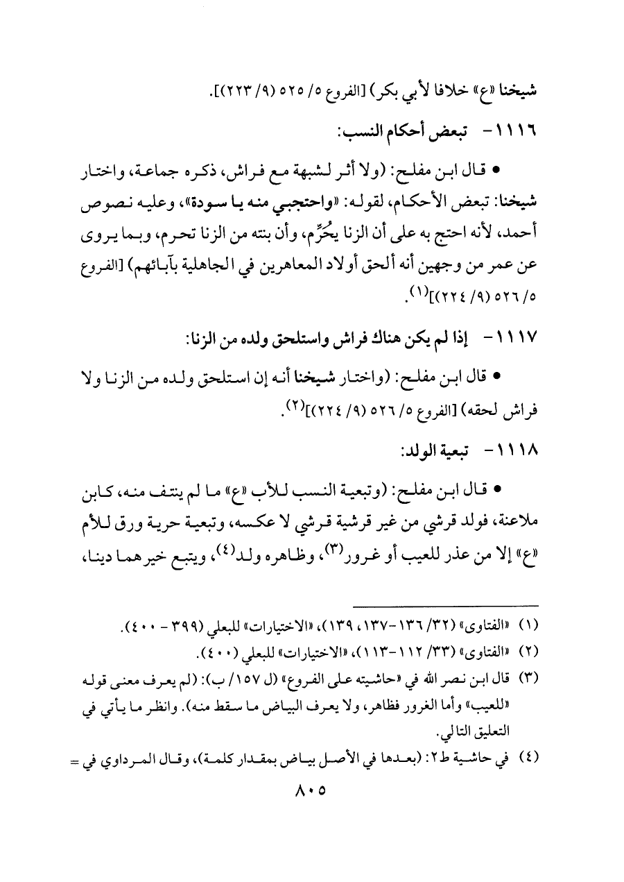 - قال ابن مفلح: (ولا أثر لشبهة مع فراش، ذكره جماعة، واختار شيخنا: تبعض الأحكام، لقوله: «واحتجبي منه يا سودة»، وعليه نصوص أحمد، لأنه احتج به على أن الزنا يُحَرِّم، وأن بنته من الزنا تحرم، وبما يروى عن عمر من وجهين أنه ألحق أولاد المعاهرين في الجاهلية بآبائهم) [الفروع ٥/ ٥٢٦ (٩/ ٢٢٤)] (¬١).