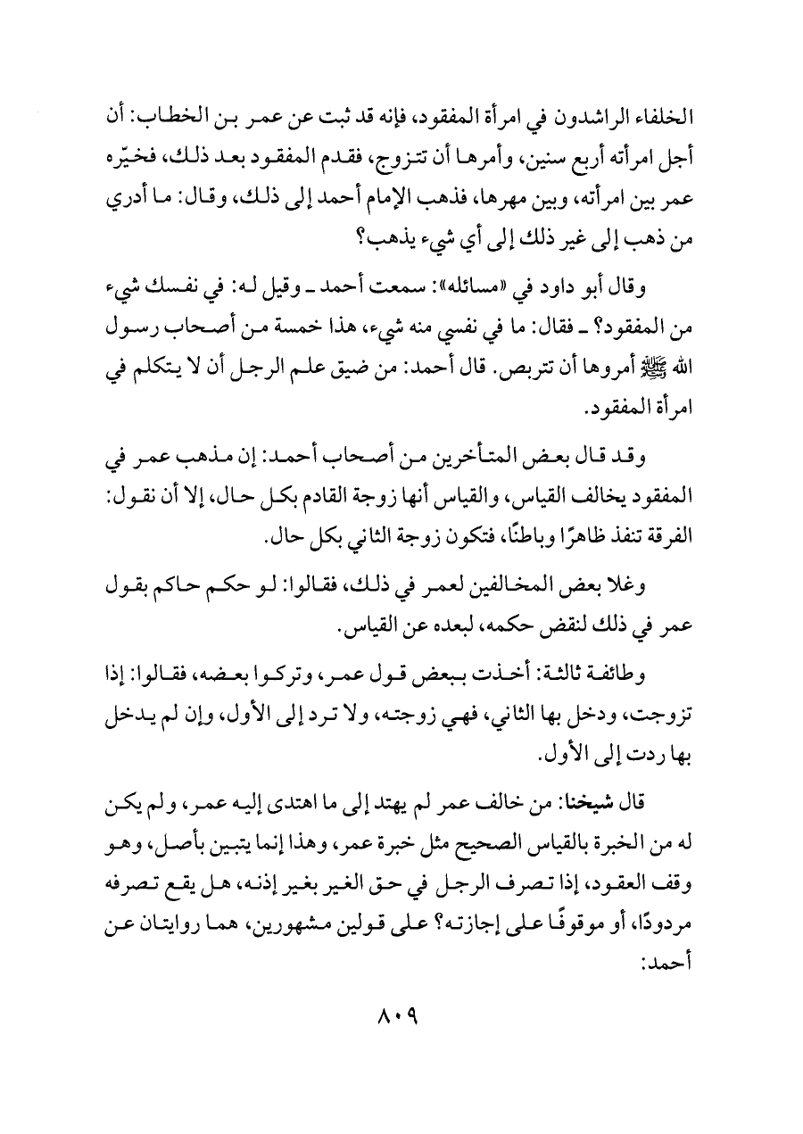 الخلفاء الراشدون في امرأة المفقود، فإنه قد ثبت عن عمر بن الخطاب: أن أجل امرأته أربع سنين، وأمرها أن تتزوج، فقدم المفقود بعد ذلك، فخيّره عمر بين امرأته، وبين مهرها، فذهب الإمام أحمد إلى ذلك، وقال: ما أدري من ذهب إلى غير ذلك إلى أي شيء يذهب؟