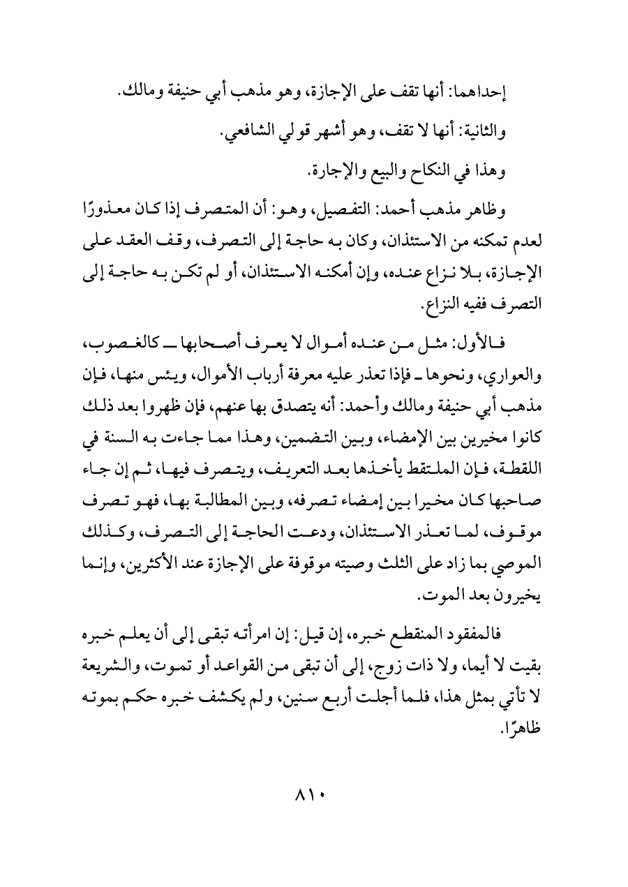 وظاهر مذهب أحمد: التفصيل، وهو: أن المتصرف إذا كان معذورًا لعدم تمكنه من الاستئذان، وكان به حاجة إلى التصرف، وقف العقد على الإجازة، بلا نزاع عنده، وإن أمكنه الاستئذان، أو لم تكن به حاجة إلى التصرف ففيه النزاع.