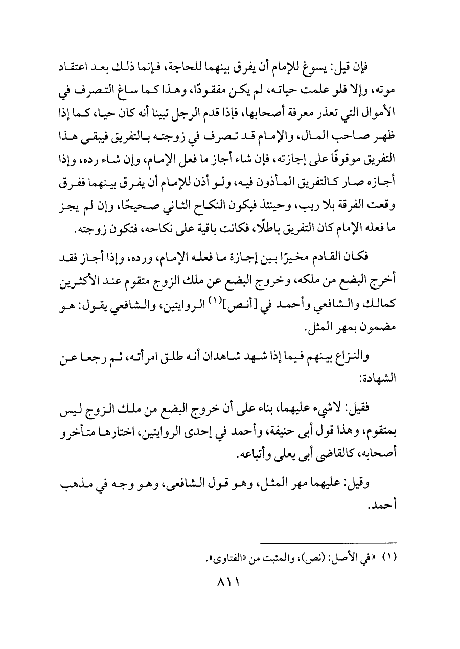 فإن قيل: يسوغ للإمام أن يفرق بينهما للحاجة، فإنما ذلك بعد اعتقاد موته، وإلا فلو علمت حياته، لم يكن مفقودًا، وهذا كما ساغ التصرف في الأموال التي تعذر معرفة أصحابها، فإذا قدم الرجل تبينا أنه كان حيا، كما إذا ظهر صاحب المال، والإمام قد تصرف في زوجته بالتفريق فيبقى هذا التفريق موقوفًا على إجازته، فإن شاء أجاز ما فعل الإمام، وإن شاء رده، وإذا أجازه صار كالتفريق المأذون فيه، ولو أذن للإمام أن يفرق بينهما ففرق وقعت الفرقة بلا ريب، وحينئذ فيكون النكاح الثاني صحيحًا، وإن لم يجز ما فعله الإمام كان التفريق باطلًا، فكانت باقية على نكاحه، فتكون زوجته.
