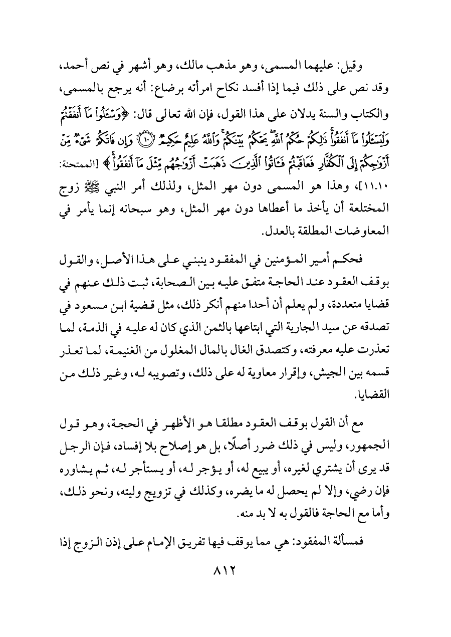 فحكم أمير المؤمنين في المفقود ينبني على هذا الأصل، والقول بوقف العقود عند الحاجة متفق عليه بين الصحابة، ثبت ذلك عنهم في قضايا متعددة، ولم يعلم أن أحدا منهم أنكر ذلك، مثل قضية ابن مسعود في تصدقه عن سيد الجارية التي ابتاعها بالثمن الذي كان له عليه في الذمة، لما تعذرت عليه معرفته، وكتصدق الغال بالمال المغلول من الغنيمة، لما تعذر قسمه بين الجيش، وإقرار معاوية له على ذلك، وتصويبه له، وغير ذلك من القضايا.