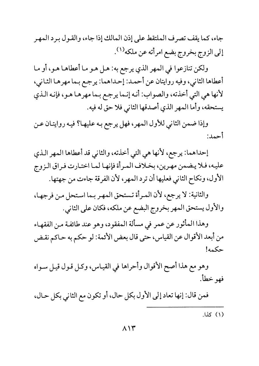 جاء، كما يقف تصرف الملتقط على إذن المالك إذا جاء، والقول برد المهر إلى الزوج بخروج بضع امرأته عن ملكه (¬١).