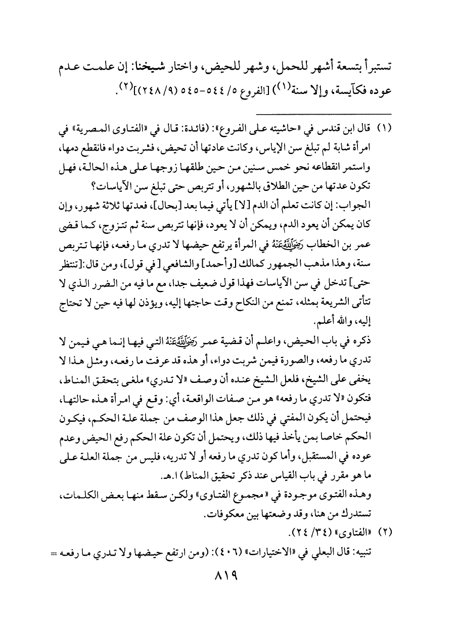 (¬١) قال ابن قندس في «حاشيته على الفروع»: (فائدة: قال في «الفتاوى المصرية» في امرأة شابة لم تبلغ سن الإياس، وكانت عادتها أن تحيض، فشربت دواء فانقطع دمها، واستمر انقطاعه نحو خمس سنين من حين طلقها زوجها على هذه الحالة، فهل تكون عدتها من حين الطلاق بالشهور، أو تتربص حتى تبلغ سن الآياسات؟