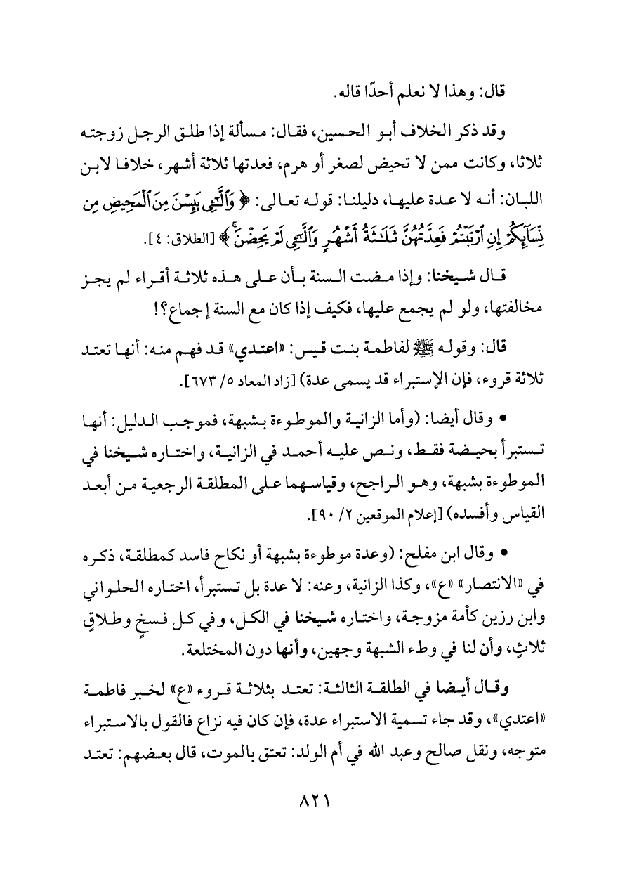 وقال أيضا في الطلقة الثالثة: تعتد بثلاثة قروء «ع» لخبر فاطمة «اعتدي»، وقد جاء تسمية الاستبراء عدة، فإن كان فيه نزاع فالقول بالاستبراء متوجه، ونقل صالح وعبد الله في أم الولد: تعتق بالموت، قال بعضهم: تعتد