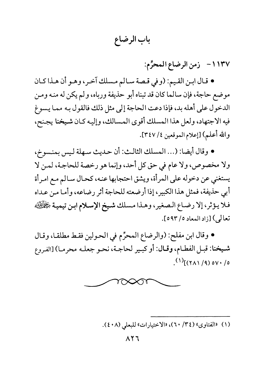 - وقال ابن مفلح: (والرضاع المحرِّم في الحولين فقط مطلقا، وقال شيخنا: قبل الفطام، وقال: أو كبير لحاجة، نحو جعله محرما) [الفروع ٥/ ٥٧٠ (٩/ ٢٨١)] (¬١).