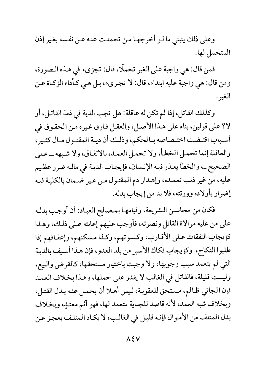 وكذلك القاتل، إذا لم تكن له عاقلة: هل تجب الدية في ذمة القاتل، أو لا؟ على قولين، بناء على هذا الأصل، والعقل فارق غيره من الحقوق في أسباب اقتضت اختصاصه بالحكم، وذلك أن دية المقتول مال كثير، والعاقلة إنما تحمل الخطأ، ولا تحمل العمد، بالاتفاق، ولا شبهه ــ على الصحيح ــ، والخطأ يعذر فيه الإنسان، فإيجاب الدية في ماله ضرر عظيم عليه، من غير ذنب تعمده، وإهدار دم المقتول من غير ضمان بالكلية فيه إضرار بأولاده وورثته، فلا بد من إيجاب بدله.