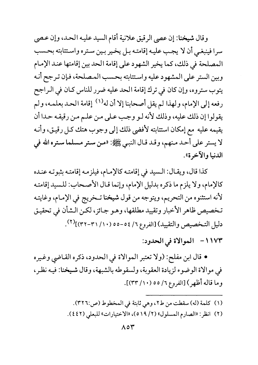 كذا قال، ويقال: السيد في إقامته كالإمام، فيلزمه إقامته بثبوته عنده كالإمام، ولا يلزم ما ذكره بدليل الإمام، وإنما قال الأصحاب: للسيد إقامته لأنه استثنوه من التحريم، ويتوجه من قول شيخنا تخريج في الإمام، وغايته تخصيص ظاهر الأخبار وتقييد مطلقها، وهو جائز، لكن الشأن في تحقيق دليل التخصيص والتقييد) [الفروع ٦/ ٥٤ - ٥٥ (١٠/ ٣١ - ٣٢)] (¬٢).