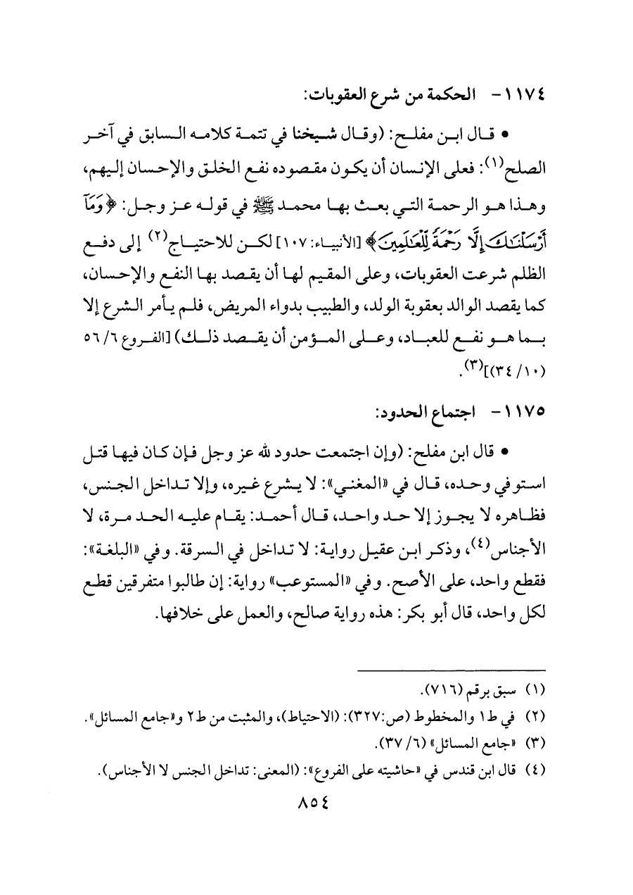 - قال ابن مفلح: (وقال شيخنا في تتمة كلامه السابق في آخر الصلح (¬١): فعلى الإنسان أن يكون مقصوده نفع الخلق والإحسان إليهم، وهذا هو الرحمة التي بعث بها محمد - صلى الله عليه وسلم - في قوله عز وجل: {وَمَا أَرْسَلْنَاكَ إِلَّا رَحْمَةً لِلْعَالَمِينَ} [الأنبياء: ١٠٧] لكن للاحتياج (¬٢) إلى دفع الظلم شرعت العقوبات، وعلى المقيم لها أن يقصد بها النفع والإحسان، كما يقصد الوالد بعقوبة الولد، والطبيب بدواء المريض، فلم يأمر الشرع إلا بما هو نفع للعباد، وعلى المؤمن أن يقصد ذلك) [الفروع ٦/ ٥٦ (١٠/ ٣٤)] (¬٣).