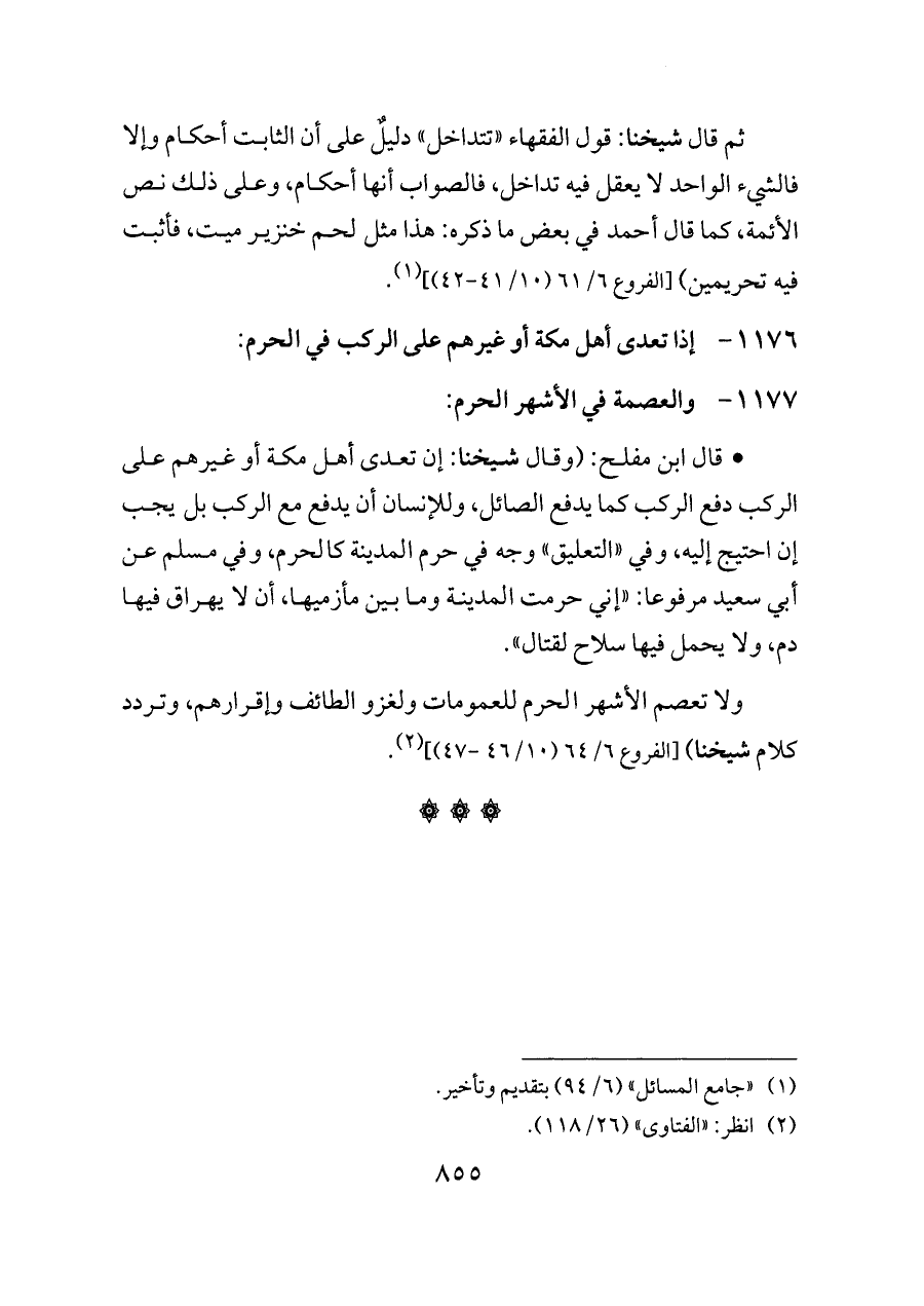 - قال ابن مفلح: (وقال شيخنا: إن تعدى أهل مكة أو غيرهم على الركب دفع الركب كما يدفع الصائل، وللإنسان أن يدفع مع الركب بل يجب إن احتيج إليه، وفي «التعليق» وجه في حرم المدينة كالحرم، وفي مسلم عن أبي سعيد مرفوعا: «إني حرمت المدينة وما بين مأزميها، أن لا يهراق فيها دم، ولا يحمل فيها سلاح لقتال».