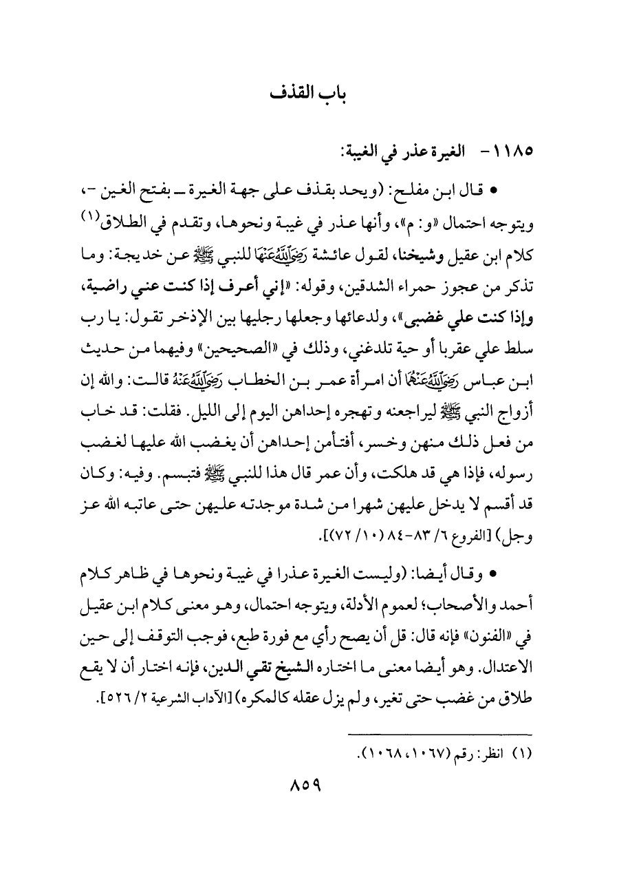 - قال ابن مفلح: (ويحد بقذف على جهة الغيرة ــ بفتح الغين -، ويتوجه احتمال «و: م»، وأنها عذر في غيبة ونحوها، وتقدم في الطلاق (¬١) كلام ابن عقيل وشيخنا، لقول عائشة - رضي الله عنها - للنبي - صلى الله عليه وسلم - عن خديجة: وما تذكر من عجوز حمراء الشدقين، وقوله: «إني أعرف إذا كنت عني راضية، وإذا كنت علي غضبى»، ولدعائها وجعلها رجليها بين الإذخر تقول: يا رب سلط علي عقربا أو حية تلدغني، وذلك في «الصحيحين» وفيهما من حديث ابن عباس - رضي الله عنهما - أن امرأة عمر بن الخطاب - رضي الله عنه - قالت: والله إن أزواج النبي - صلى الله عليه وسلم - ليراجعنه وتهجره إحداهن اليوم إلى الليل. فقلت: قد خاب من فعل ذلك منهن وخسر، أفتأمن إحداهن أن يغضب الله عليها لغضب رسوله، فإذا هي قد هلكت، وأن عمر قال هذا للنبي - صلى الله عليه وسلم - فتبسم. وفيه: وكان قد أقسم لا يدخل عليهن شهرا من شدة موجدته عليهن حتى عاتبه الله عز وجل) [الفروع ٦/ ٨٣ - ٨٤ (١٠/ ٧٢)].