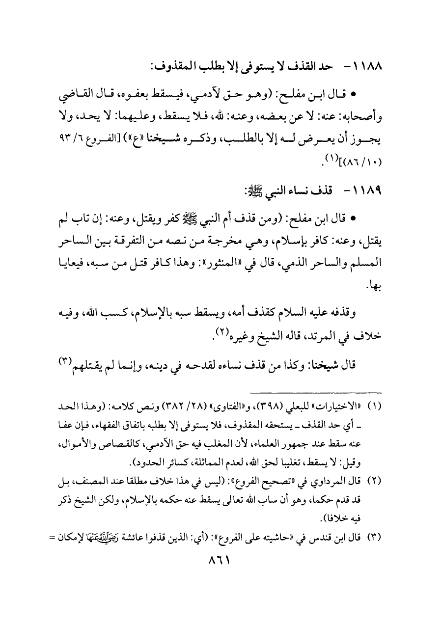 (¬٣) قال ابن قندس في «حاشيته على الفروع»: (أي: الذين قذفوا عائشة - رضي الله عنها - لإمكان المفارقة، أي: لإمكان أن النبي - صلى الله عليه وسلم - يفارقها في حياته، ويخرجها عن زوجيته، فتخرج بالمفارقة من أمهات المؤمنين).