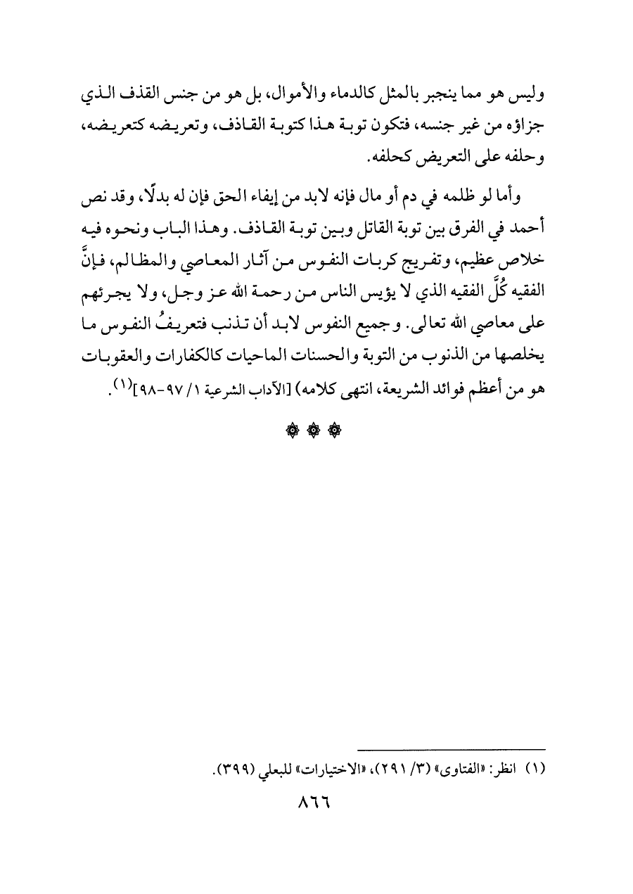 وأما لو ظلمه في دم أو مال فإنه لابد من إيفاء الحق فإن له بدلًا، وقد نص أحمد في الفرق بين توبة القاتل وبين توبة القاذف. وهذا الباب ونحوه فيه خلاص عظيم، وتفريج كربات النفوس من آثار المعاصي والمظالم، فإنَّ الفقيه كُلَّ الفقيه الذي لا يؤيس الناس من رحمة الله عز وجل، ولا يجرئهم على معاصي الله تعالى. وجميع النفوس لابد أن تذنب فتعريفُ النفوس ما يخلصها من الذنوب من التوبة والحسنات الماحيات كالكفارات والعقوبات هو من أعظم فوائد الشريعة، انتهى كلامه) [الآداب الشرعية ١/ ٩٧ - ٩٨] (¬١).