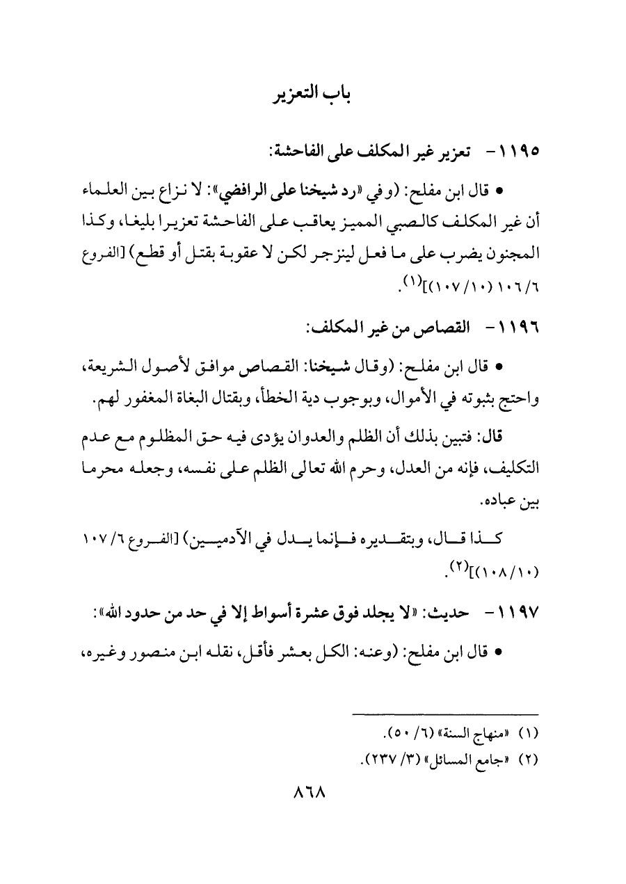 - قال ابن مفلح: (وفي «رد شيخنا على الرافضي»: لا نزاع بين العلماء أن غير المكلف كالصبي المميز يعاقب على الفاحشة تعزيرا بليغا، وكذا المجنون يضرب على ما فعل لينزجر لكن لا عقوبة بقتل أو قطع) [الفروع ٦/ ١٠٦ (١٠/ ١٠٧)] (¬١).