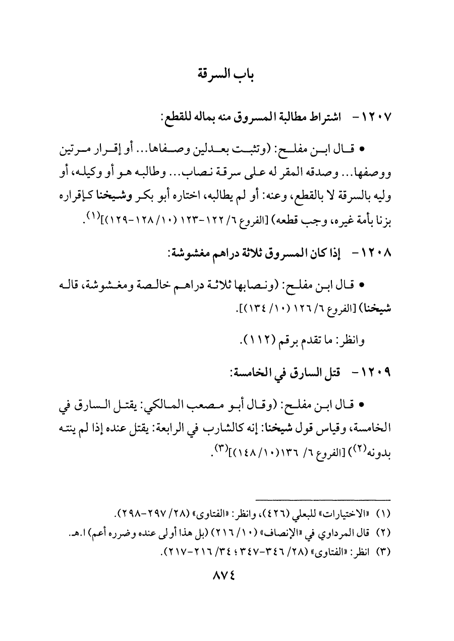 - قال ابن مفلح: (وتثبت بعدلين وصفاها ... أو إقرار مرتين ووصفها ... وصدقه المقر له على سرقة نصاب ... وطالبه هو أو وكيله، أو وليه بالسرقة لا بالقطع، وعنه: أو لم يطالبه، اختاره أبو بكر وشيخنا كإقراره بزنا بأمة غيره، وجب قطعه) [الفروع ٦/ ١٢٢ - ١٢٣ (١٠/ ١٢٨ - ١٢٩)] (¬١).